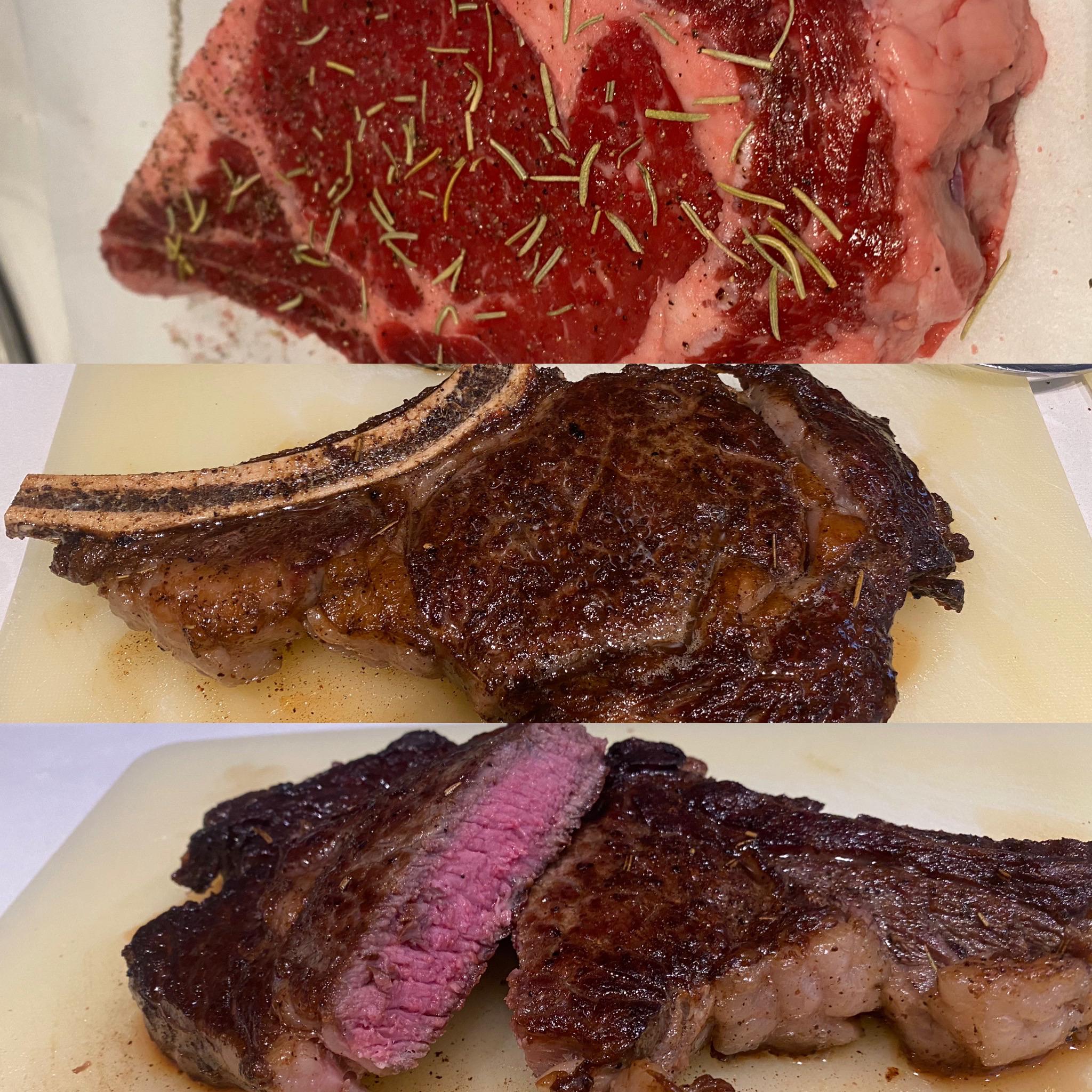 1/3 cup finely minced fresh parsley, plus more if needed. Add butter, rosemary, and garlic to skillet, tilt pan toward you so that butter pools on one side, and use a large spoon to continually baste steak with butter. Turn over the steak with tongs. Cook for 5 to 7 minutes basting the steaks with butter every couple of minutes. The center bone keeps the steak from browning evenly.  Source: thepeasantsdaughter.net